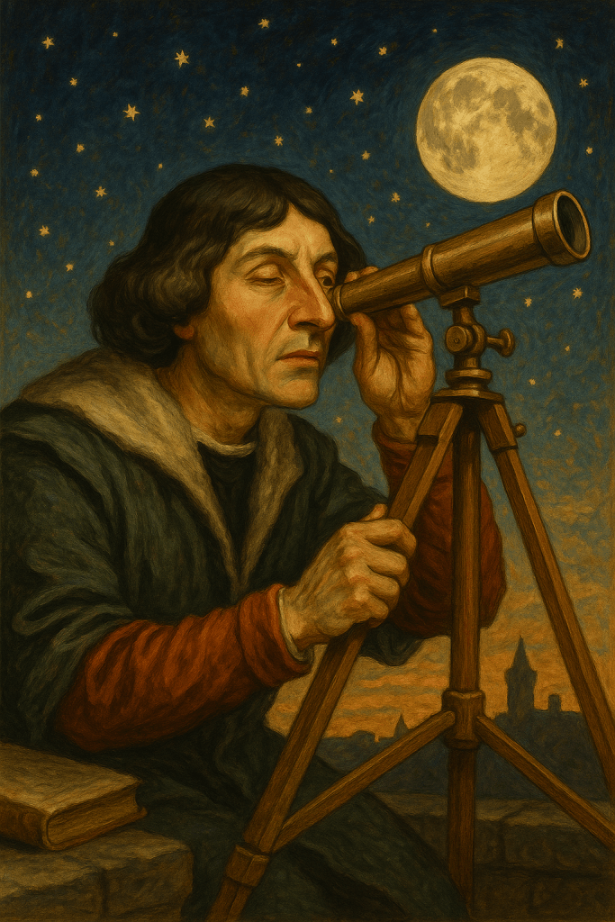 Mit der Astronomie, die ihn so berühmt machte, beschäftigte er sich privat sehr intensiv. Im Jahre 1501 veröffentlichte er eine kleine Schrift, in der er vorsichtig andeutete, nicht die Erde, sondern die Sonne könne im Mittelpunkt des Alls stehen. In seinem Todesjahr erschien sein Buch „Über die Umläufe der Himmelskörper“, in dem er die Erde als Krönung der Schöpfung entthronte und die Sonne in den Mittelpunkt rückte (heliozentrisches Weltbild). Diese wichtige Änderung und die Abkehr vom ptolemäischen Weltbild nennt man die „kopernikanische Wende“. Kopernikus selbst konnte seine Theorie nicht beweisen, dies gelang erst späteren Astronomen. Die Verbannung der Erde aus dem Zentrum des Weltalls hat das Selbstbewusstseins der Menschen damals tief getroffen. Heute wird das Weltbild noch radikaler erschüttert und die Erde an den Rand des Universums gerückt, das selbst nur noch eines von zahllosen Universen ist (Unser Kosmos – Was ist Was, Bd. 102).
